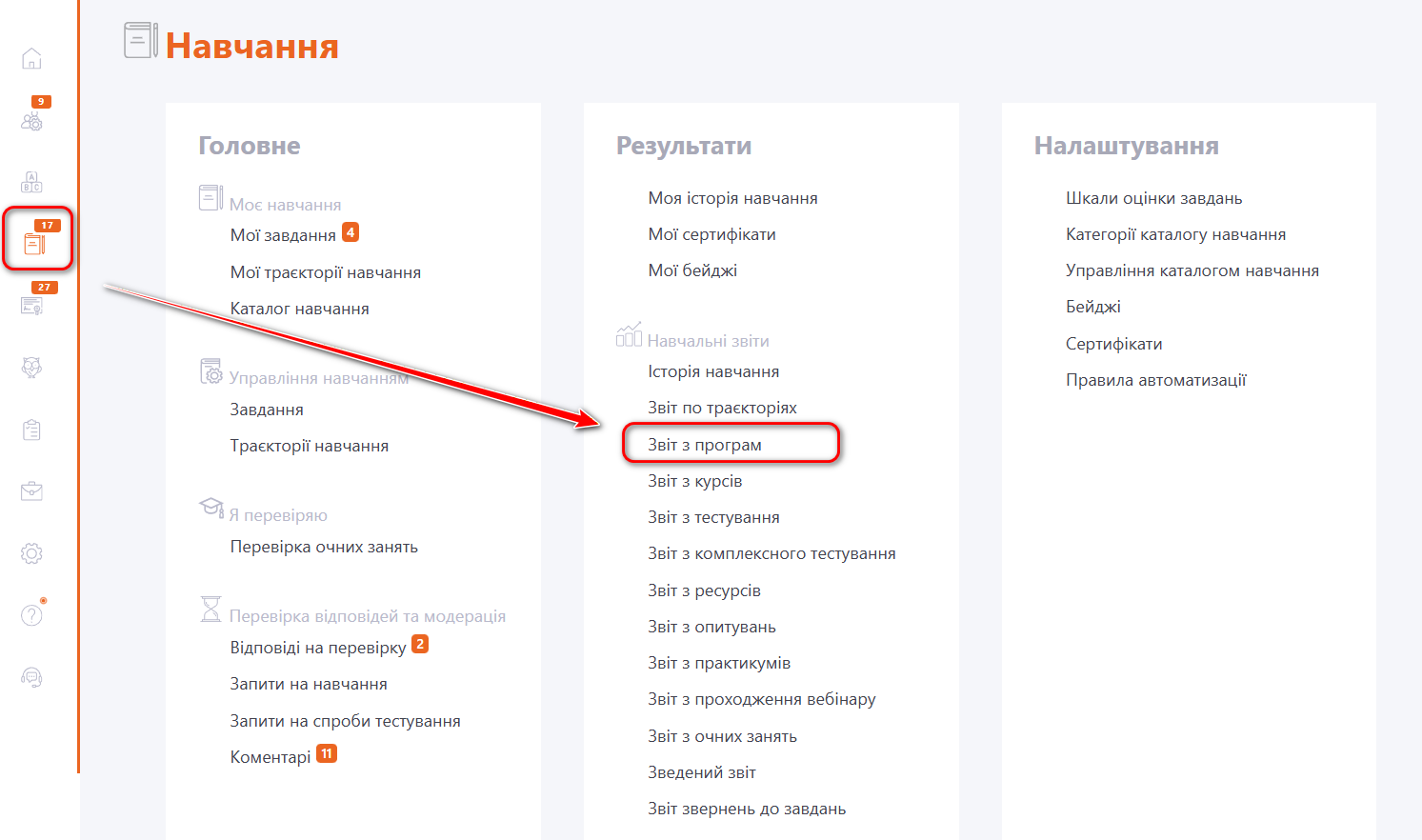 Для перегляду звітів з навчальних програм потрібно перейти в меню Навчання - Навчальні звіти - Звіт з програм