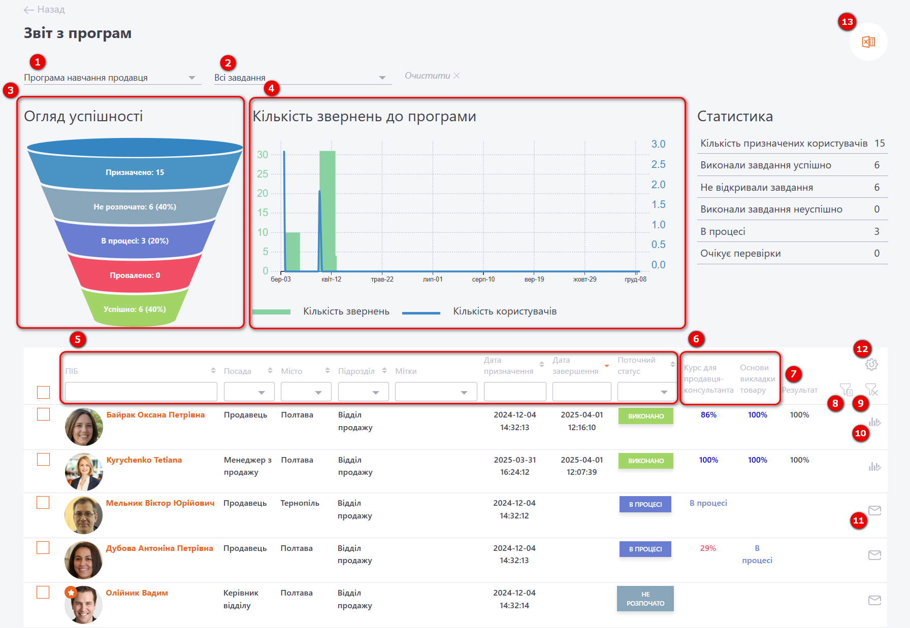 • Успішно - кількість всіх користувачів, що успішно пройшли програму (статус виконання завдання у таких користувачів "Виконано");