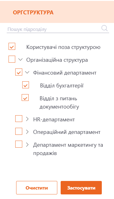 Фільтр відображає користувачів у таблиці залежно від обраних папок організаційної структури.