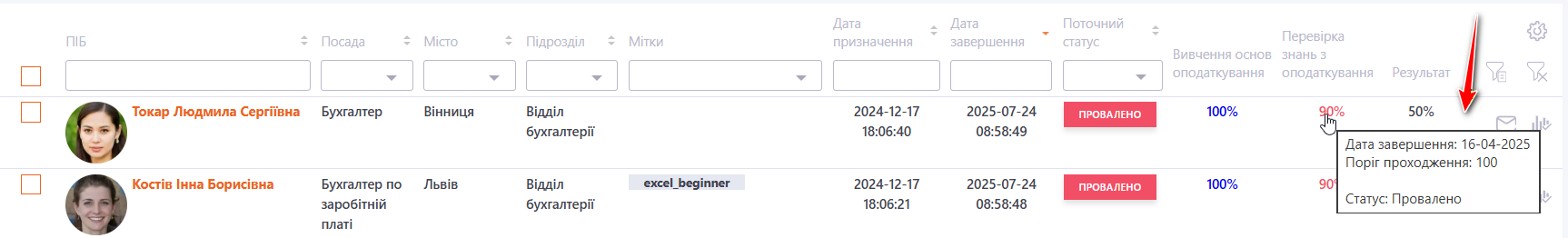 Також по кожному завданню Програми відображається результат проходження у відсотках. Оцінка за кожен елемент Програми клікабельна, веде до детального звіту з проходження даного елемента окремим користувачем.