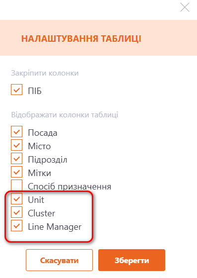 За допомогою кнопки Налаштування таблиці (12), можна налаштувати відобрaження колонок у звіті, включно з додатковими полями користувачів: