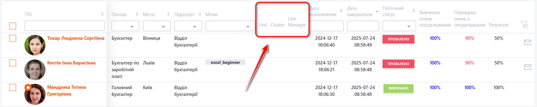 Дані користувача (5) : ПІБ, Посада, Місто, Підрозділ, Мітки, Дата призначення, Дата завершення, Поточний статус - всі поля доступні для фільтрування і сортування.