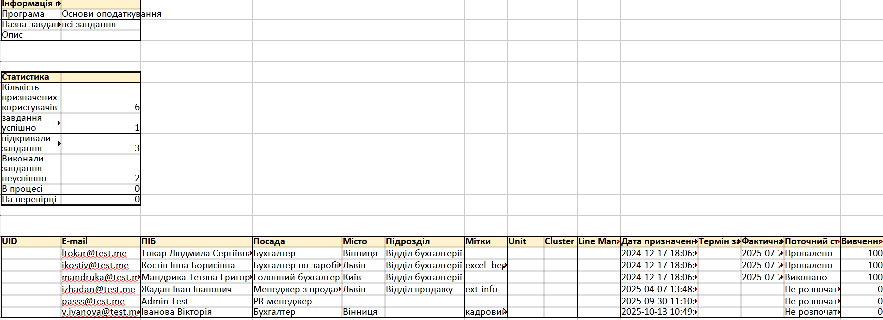 • Провалено - кількість всіх користувачів, що не успішно пройшли програму (статус виконання завдань - "Провалено");