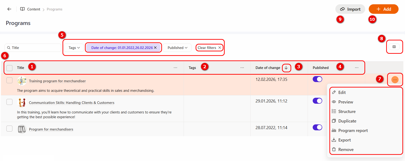 (10) - Add - clicking the button will open the program creation page. For more information: Creating and editing a program