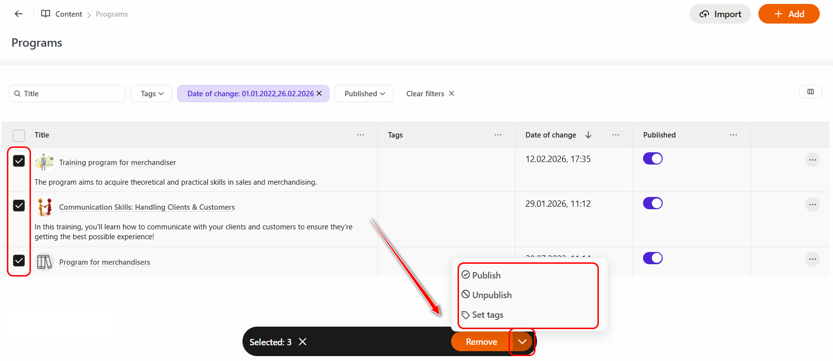 By default, the "Remove" button is available, and by clicking on the arrow next to it, you can additional options: Publish, Unpublish, or Set tags.