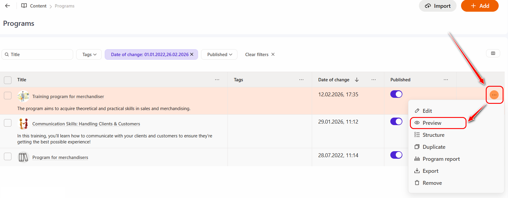 - Structure - navigates to the view and edit page of structure of program. More details: Editing a program structure;