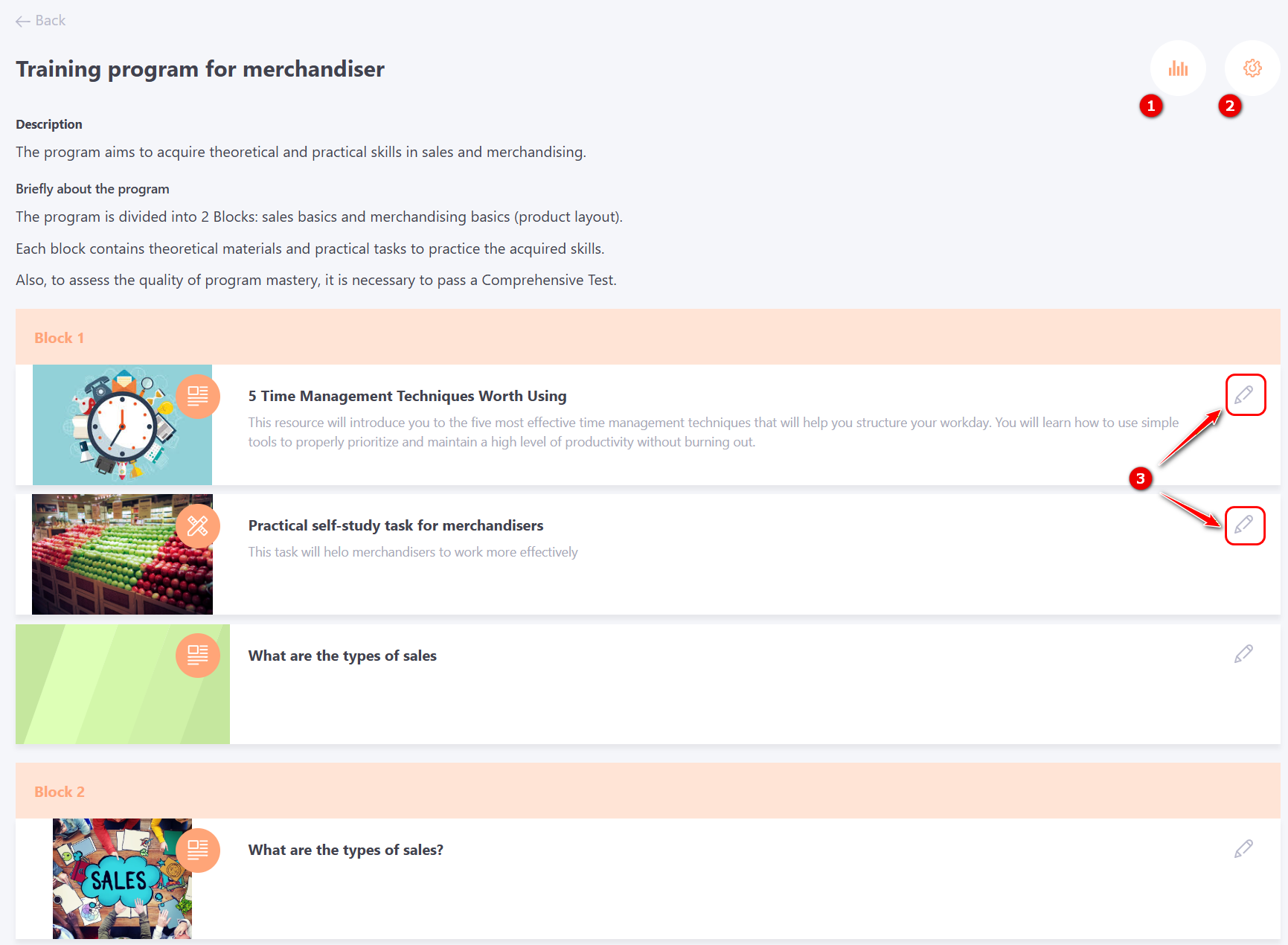 Next, the page with the program plan will open. On this page you can go to the program report (1) or to its settings (editing the program or editing the program structure) (2). It is also possible to go to editing each element of the program (3).