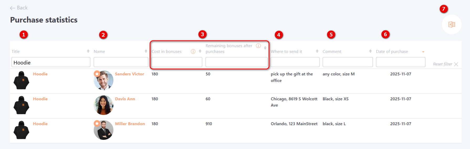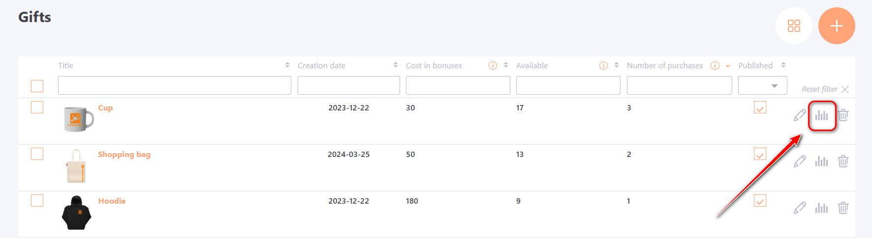 For Portal Administrators (the permission Manage Gift shop is enabled for the role), you can view purchase statistics on the Gifts page: