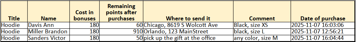 If a purchase has been made, a notification is sent to the Administrator according to the template Gift shop - Purchased gifts for the past day: