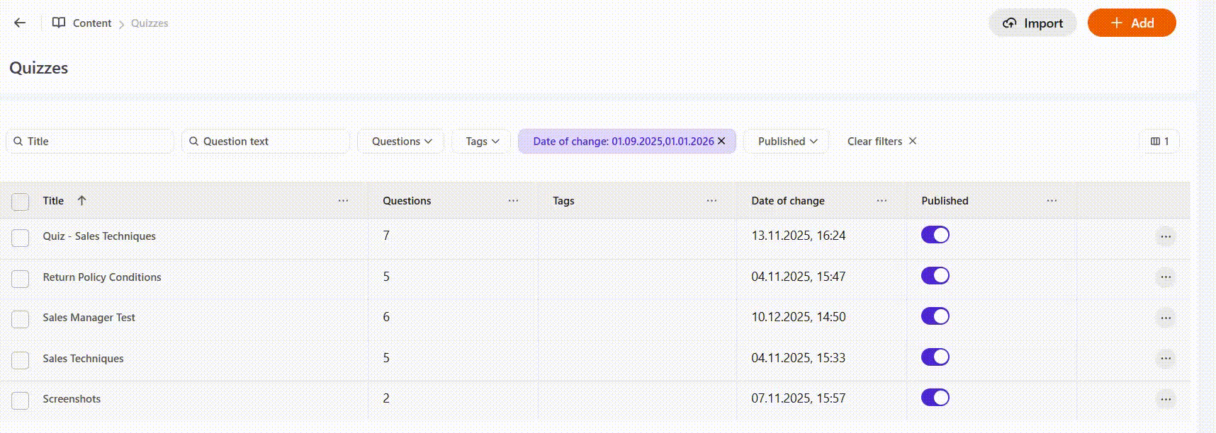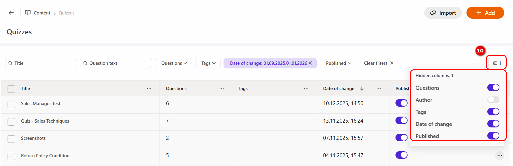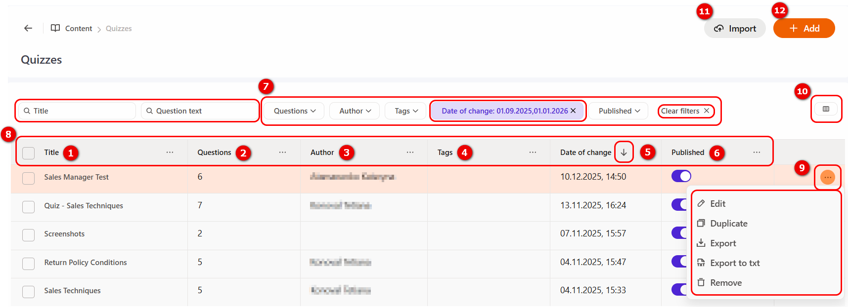 Sorting (8) is available for any column in the table, but it can only be applied to one parameter at a time. By default, quizzes are sorted by the Date of change.