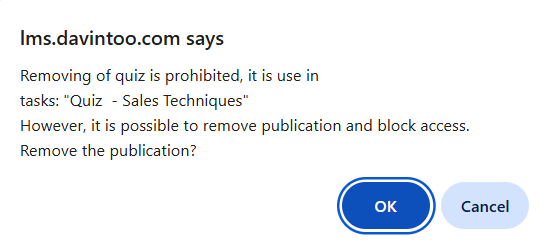 - Remove – delete the quiz along with its questions. After clicking "Remove", a confirmation window will appear. If the quiz is currently used in courses, programs, or assignments, it cannot be deleted. In this case, the system will suggest unpublishing it instead of deletion.