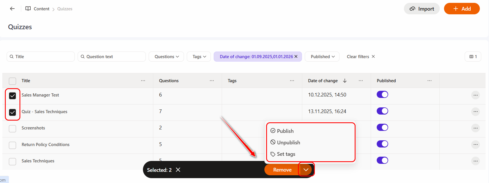 For convenient work with quizzes, the possibility of group actions is provided. For this, it is necessary to mark the required quizzes using checkboxes - after which a panel with available actions will appear at the bottom of the screen. By default, the «Remove» button is available, and by clicking on the arrow next to it, you can select additional options: Publish, Unpublish or Set tags.