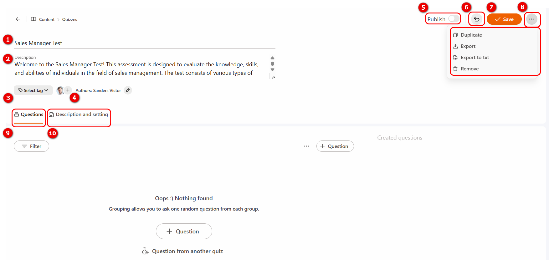 (4) - Author - full name of the user who created the quiz. The field is filled automatically, but the author can be changed or co-authors can be added. More details: Authors and co-authors for quizzes.