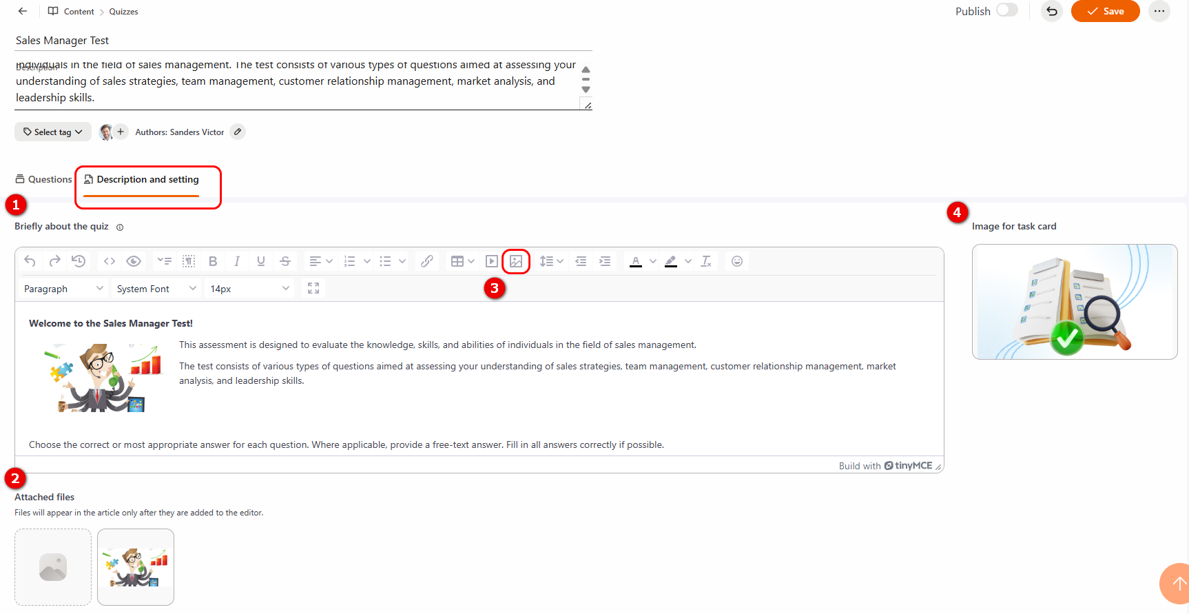 (2) - Attached files - uploading files for use in the text editor of the “Briefly about the quiz (1)“ block via the “Select image (3)” button