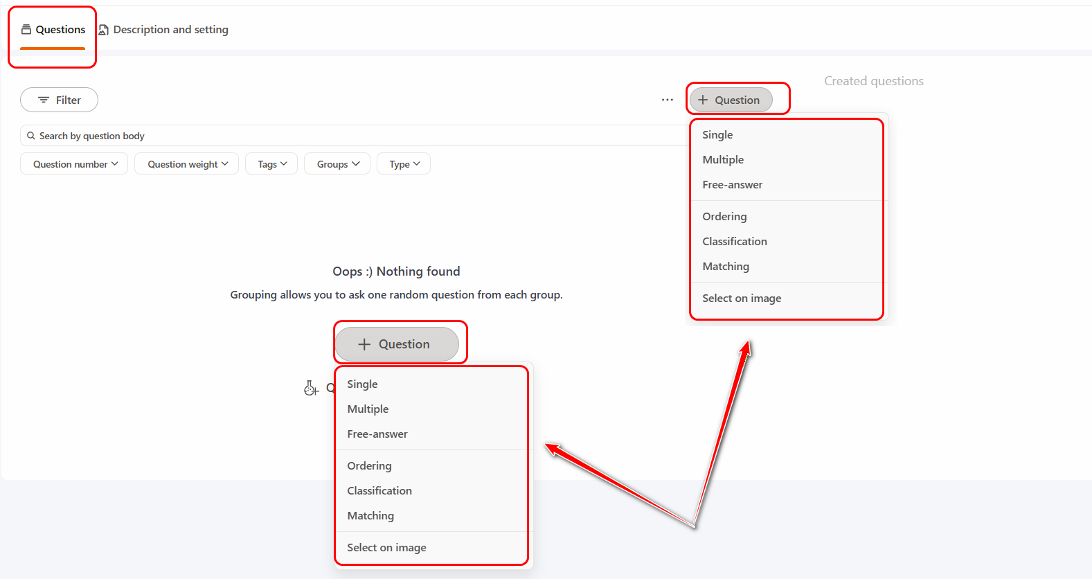 (1) - Filter - a search is available for quiz questions by question text, number, weight of the question, tags, groups, and type.