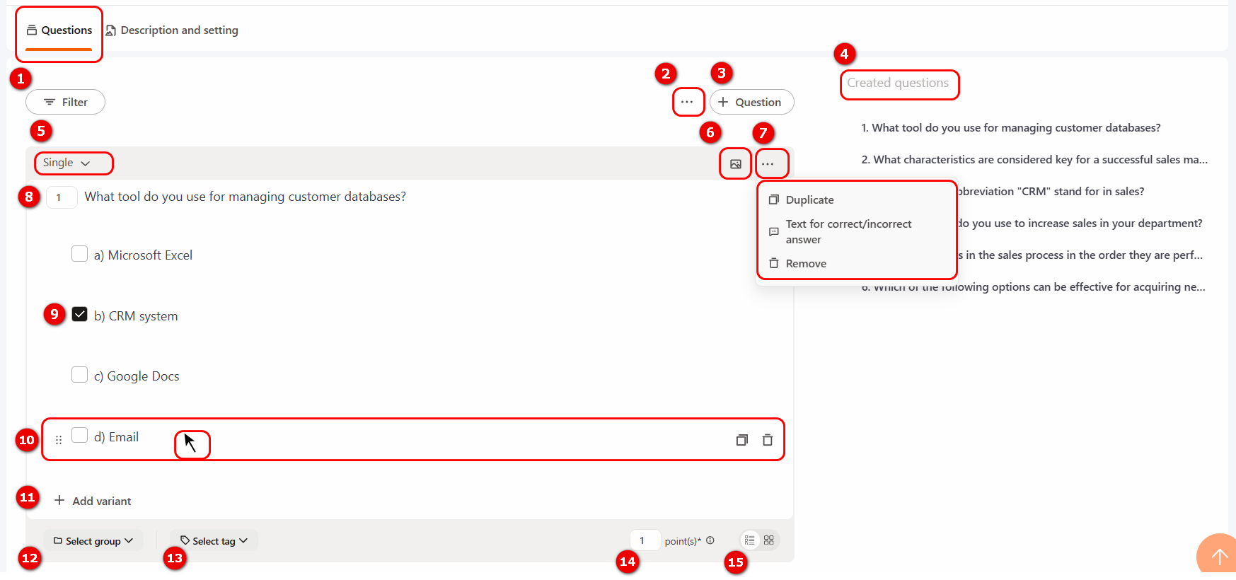 (5) - Question type - available for editing when creating questions. More details about question types in the article Types of questions in quiz;