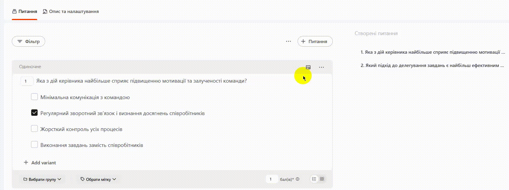 Приклад переміщення, дублювання та видалення варіанта відповідей.