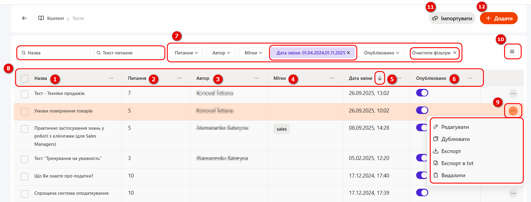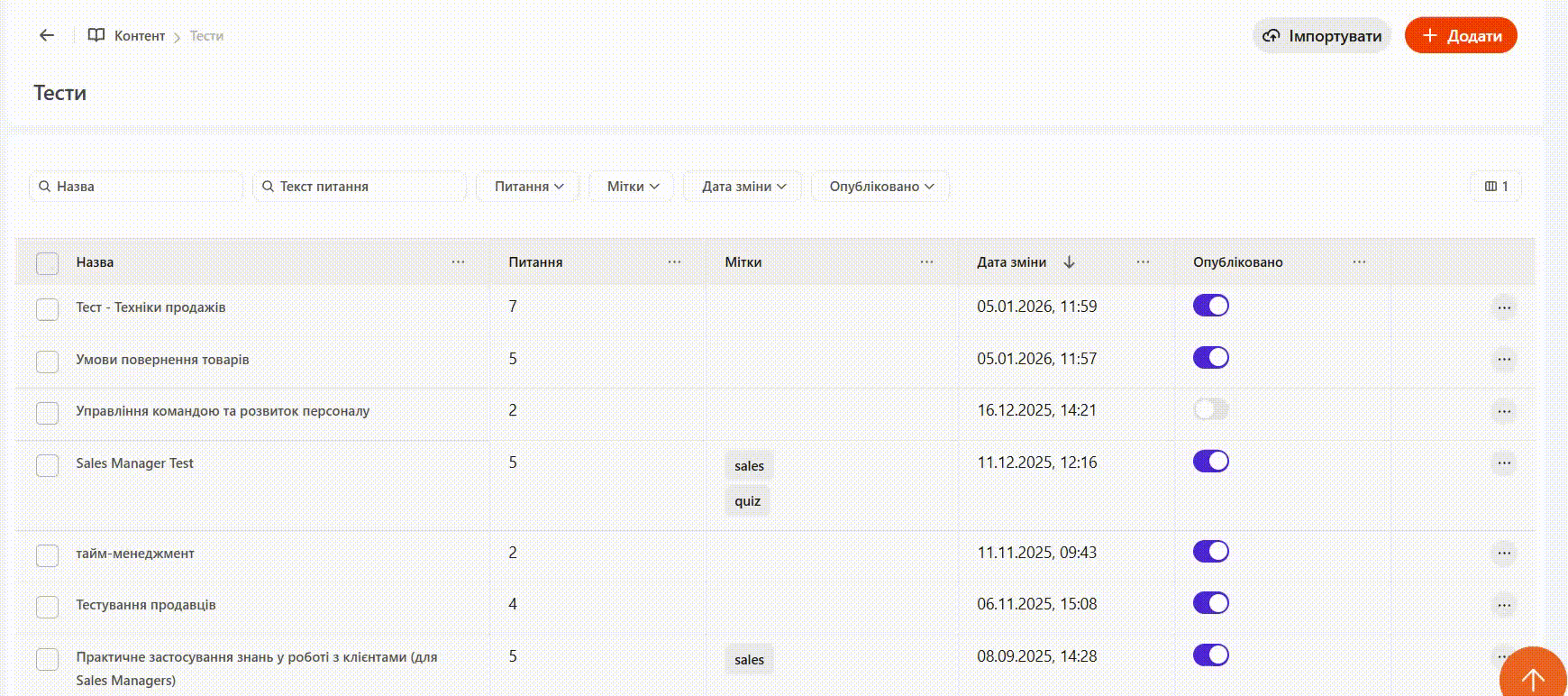 На сторінці Тести відображається перелік усіх створених тестів у вигляді таблиці з такими стовпцями: