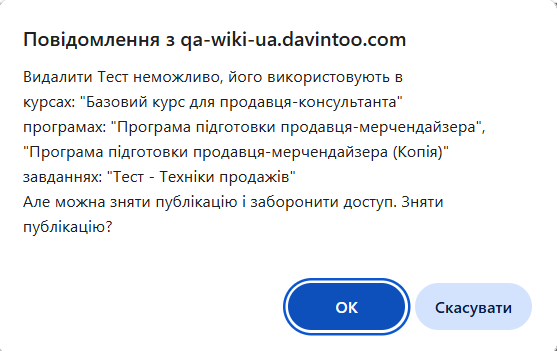 - Видалити - видалення тесту разом із питаннями. Після натискання кнопки "Видалити" відкривається вікно для підтвердження видалення. Якщо тест використовується в курсах, програмах чи завданнях, видалити його неможливо, система запропонує замість видалення зняти публікацію: