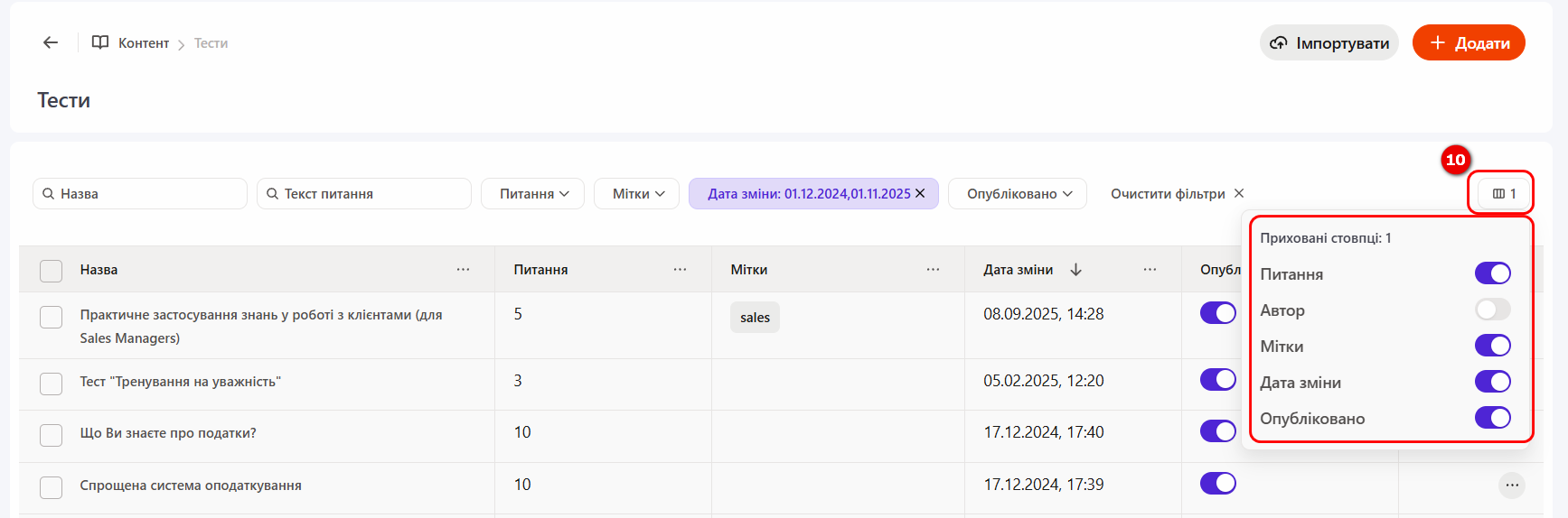 За допомогою кнопки «Приховані стовпці (10)» можна налаштувати відображенння стовпців з потрібною інформацією. Якщо перемикач увімкнено (синього кольору), відповідний стовпець відображається в таблиці; якщо вимкнено — стовпець приховано. Кількість прихованих стовпців вказана безпосередньо на кнопці.