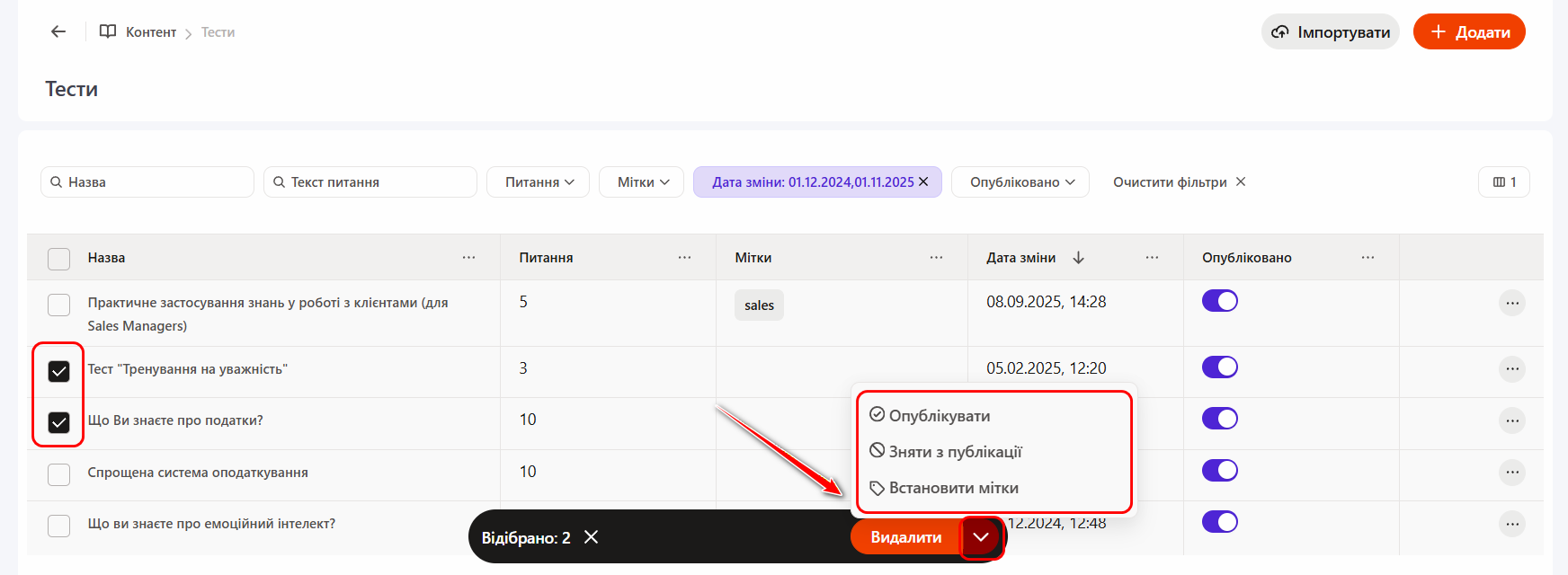 Для зручної роботи з тестами передбачено можливість групових дій. Для цього необхідно позначити потрібні тести за допомогою чекбоксів - після чого в нижній частині екрана з’явиться панель із доступними діями.