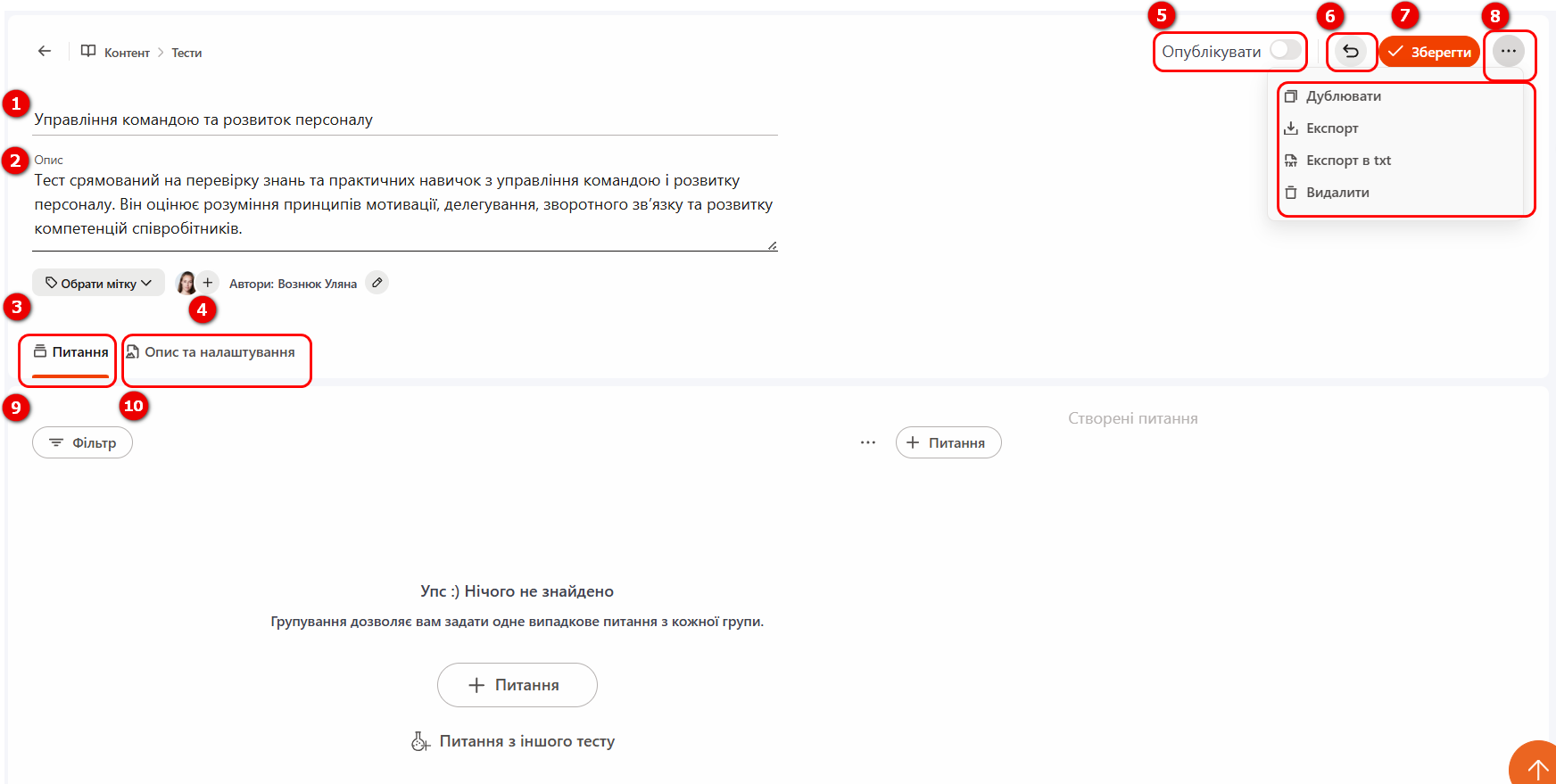 (4) - Автор - ПІБ користувача, який створив тест. Поле заповнюється автоматично, проте автора можна змінити або додати співавторів. Детальніше: Автори та співавтори для тестів