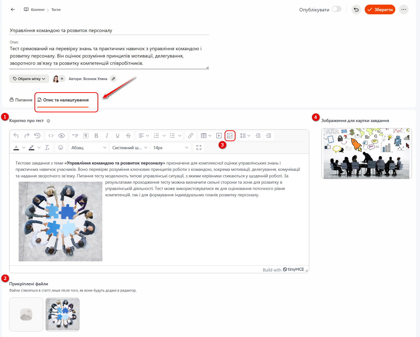 (2) - Прикріплені файли - завантаження файлів для використання в текстовому редакторі блоку "Коротко про тест (1)" через кнопку "Вибрати зображення (3)