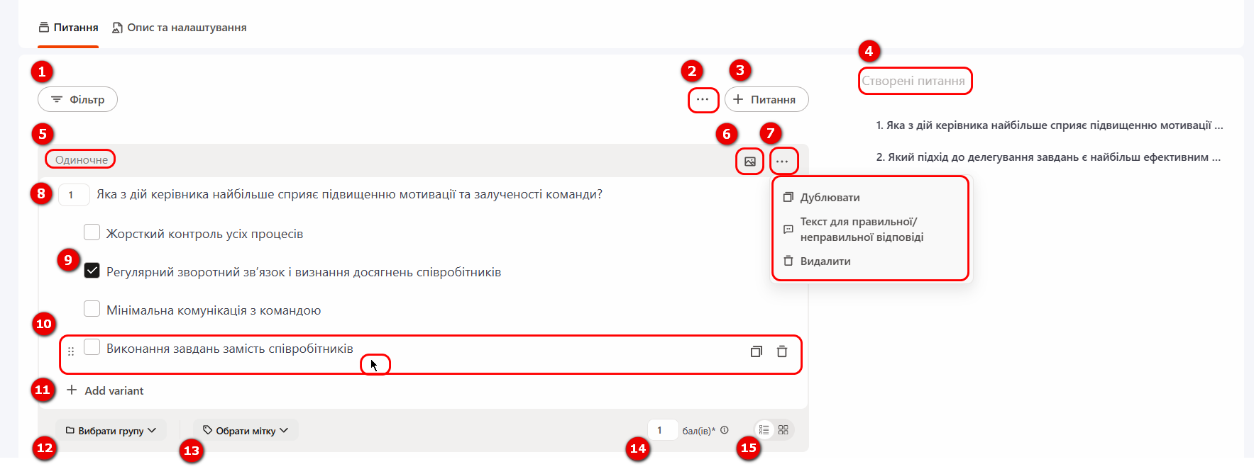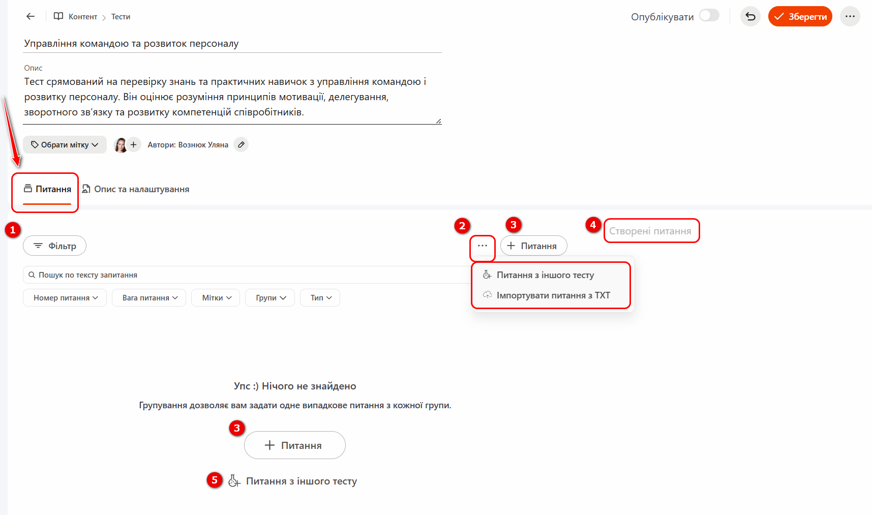 (5) - Питання з іншого тесту - додавання питань з раніше створених тестів. Детальніше: Копіювання питань з тестів