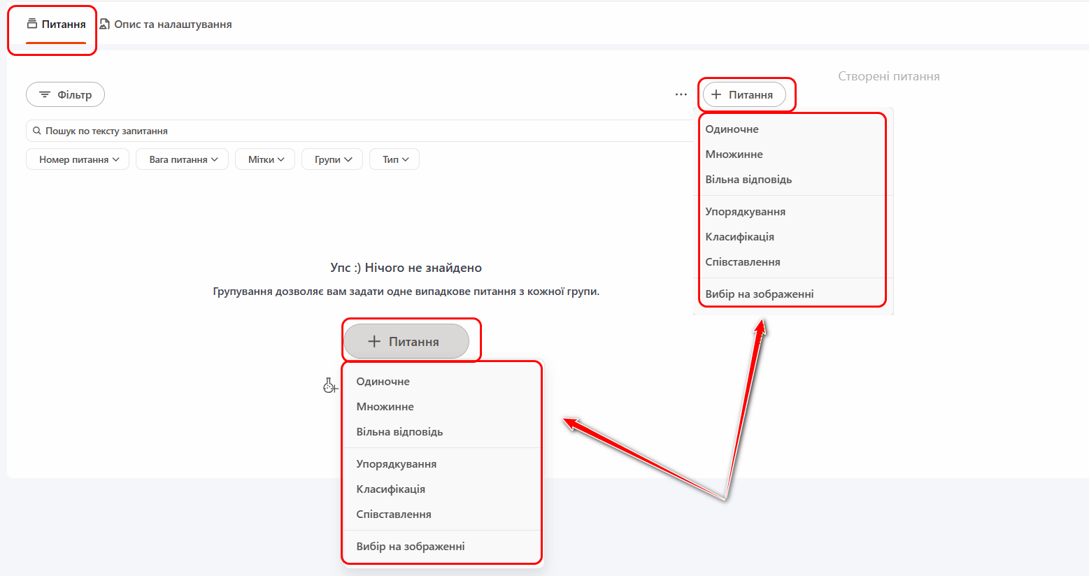 Питання з іншого тесту - додавання питань з раніше створених тестів. Детальніше: Копіювання питань з тестів.