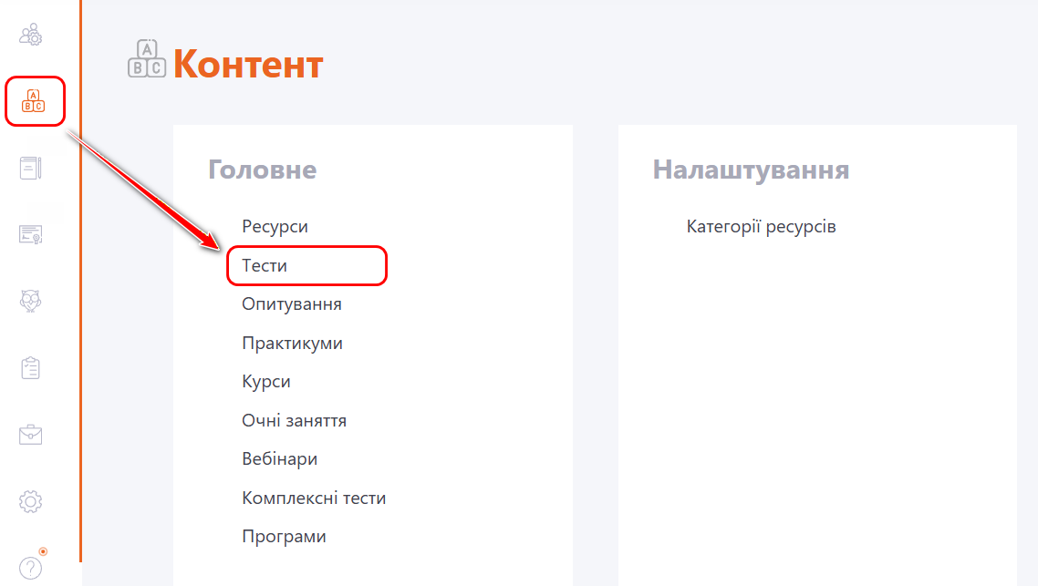Для переходу до таблиці з тестами і створення нового тесту увійдіть в Меню Контент - Тести: