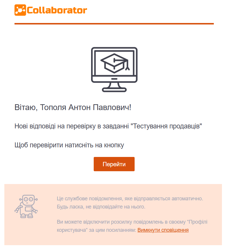 Повідомлення про нові відповіді на перевірку, що відправляється користувачам, що мають ролі з дозволами перевіряти відповіді на запитання з вільною відповіддю, перевіряти відповіді на запитання з вільною відповіддю для своїх підлеглих чи перевіряти відповіді на запитання з вільною відповіддю для своїх завдань (детальніше про права та ролі в системі в статті - Ролі в LMS Collaborator).
