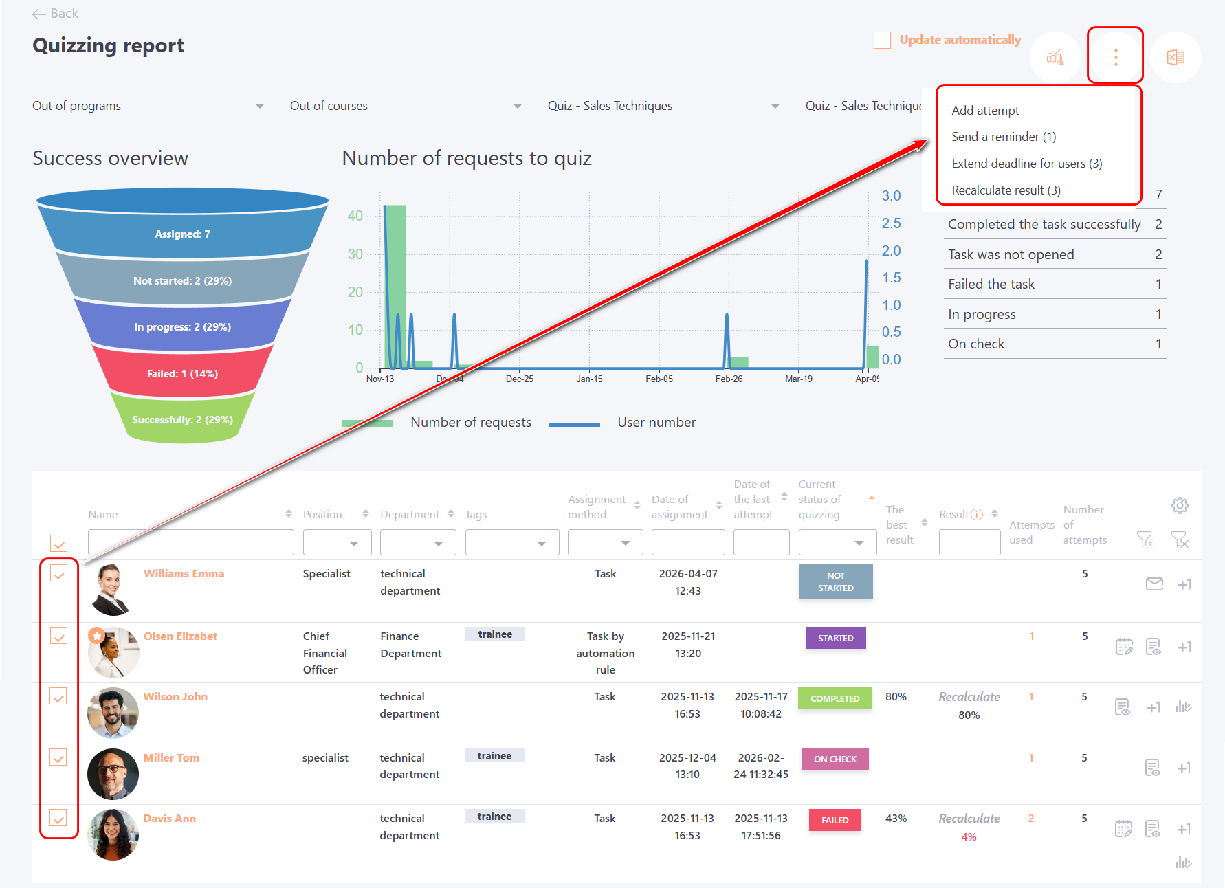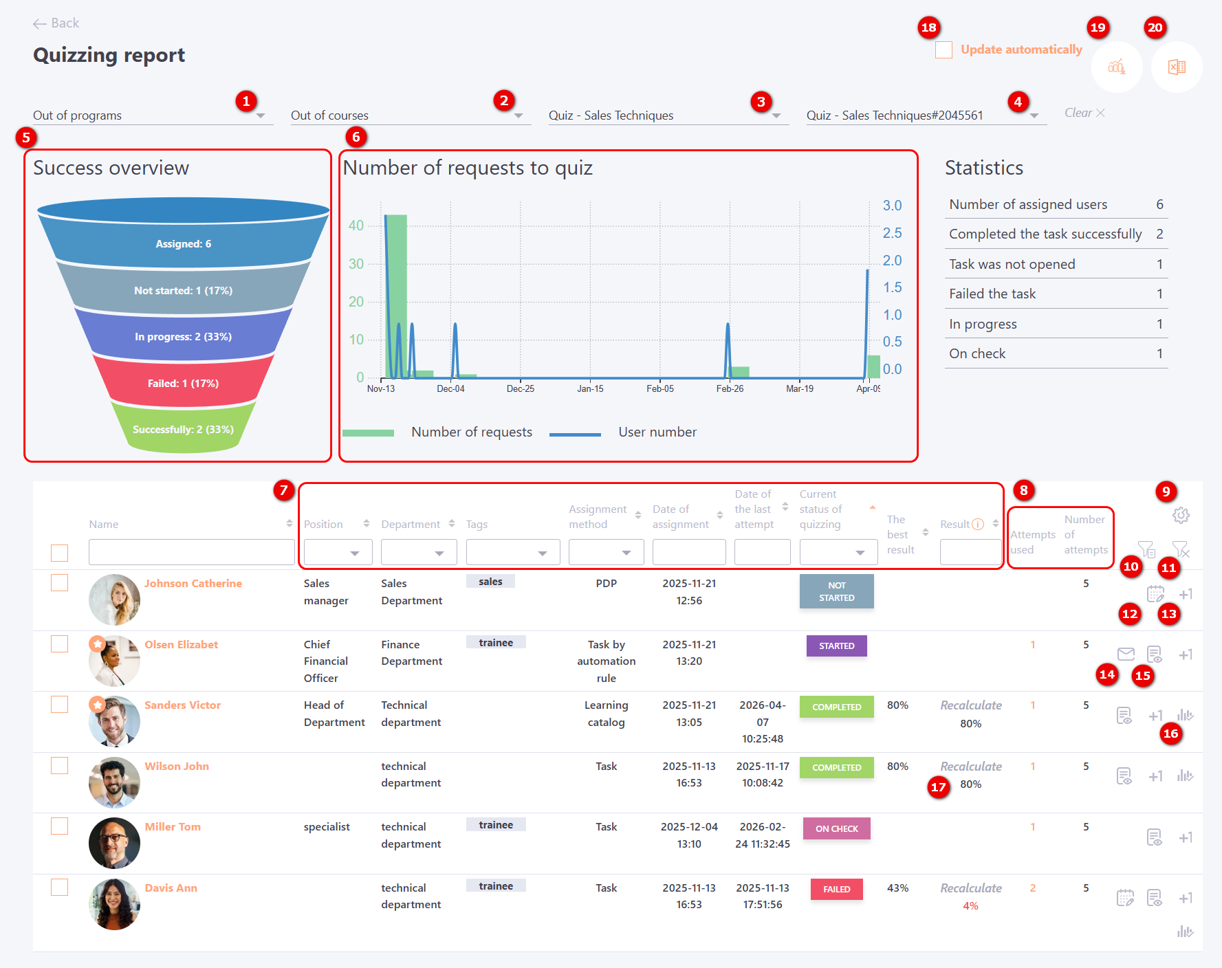 - Successfully - the number of all users who have successfully passed the quiz (the status of the task for such users is "Completed");