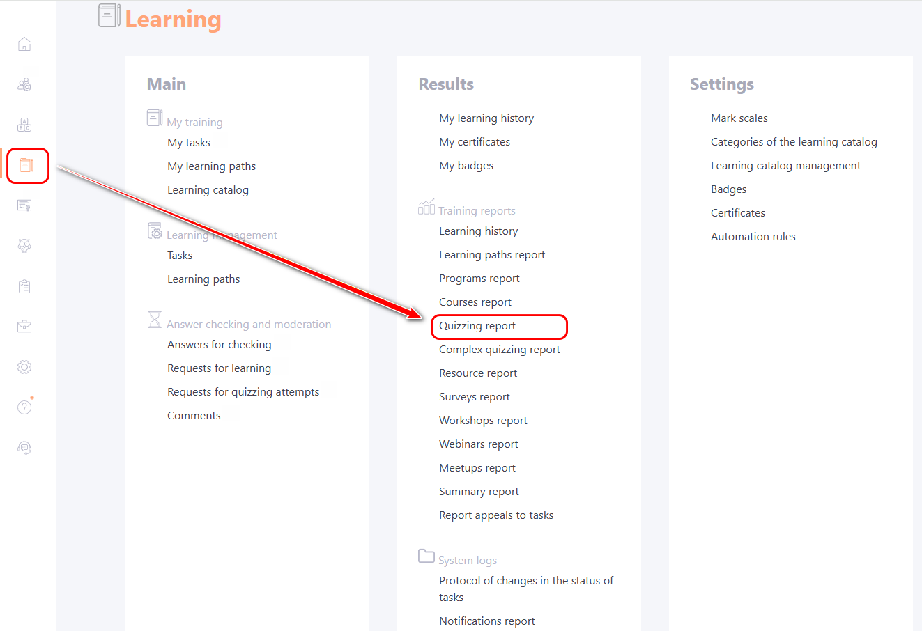 To view quiz reports, select the Learning - Training reports - Quizzing reports menu: