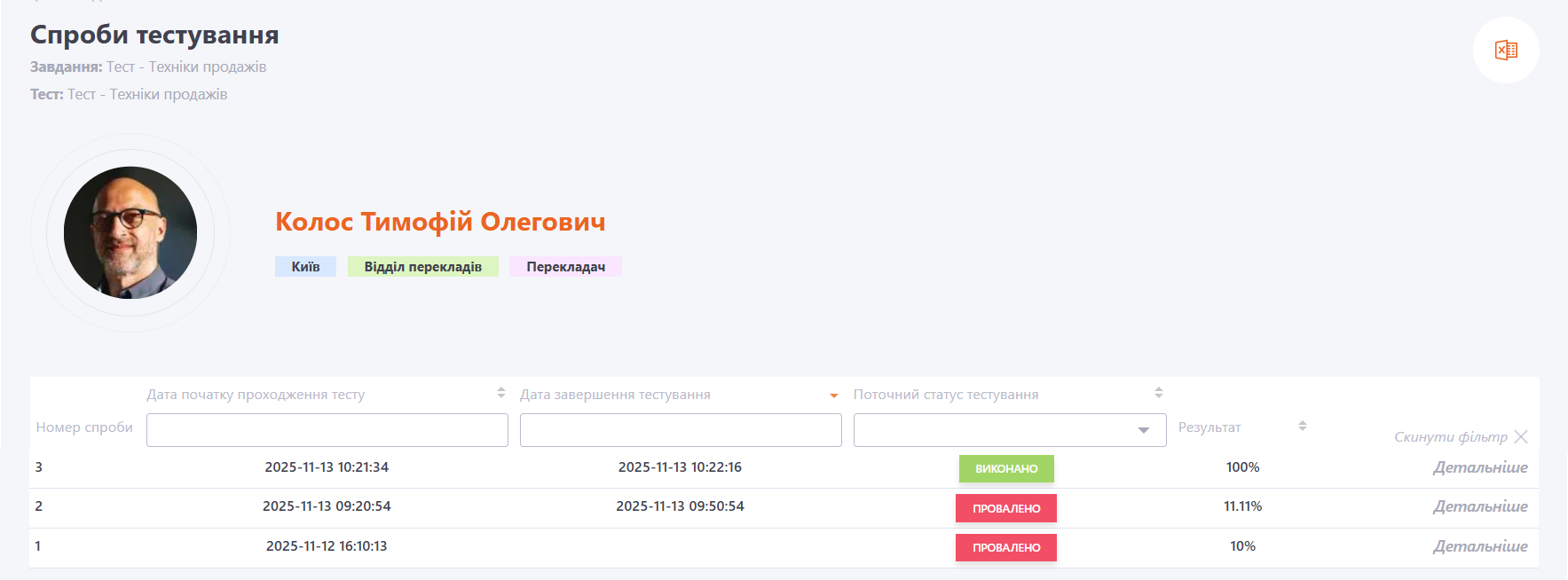 Інформація про всі спроби тестування зберігається в звітах. В загальній таблиці вона відображається у вигляді чисел у полі Використано спроб. Після натискання на ці цифри відображається сторінка Спроби тестування з інформацією щодо кожної спроби: