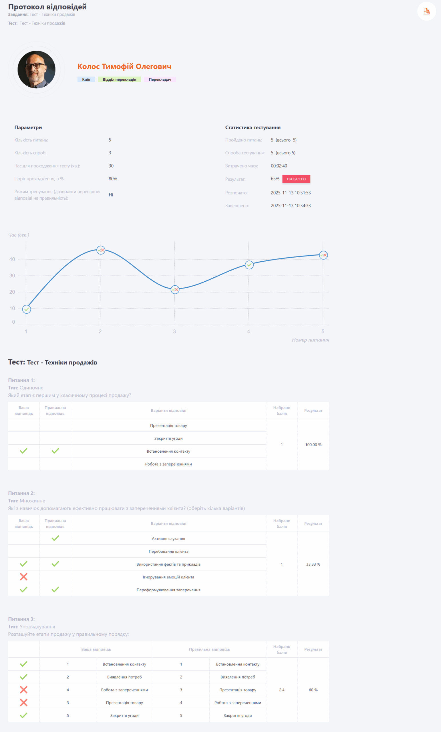 На сторінці Протокол відповідей відображається інформація про параметри тесту, статистику тестування користувача, графік відповідей користувача залежно від витраченого часу на кожну відповідь та інформація про відповіді на кожне питання.