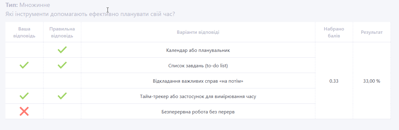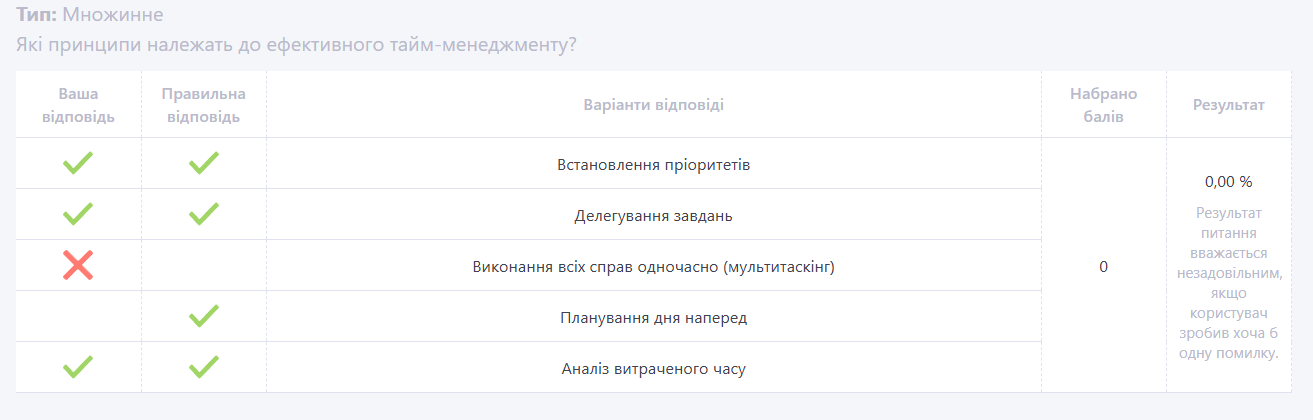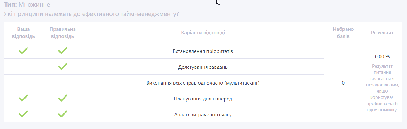 Приклад відображення результату в Протоколі відповідей питання множинного типу з Метод підрахунку балів - Все або нічого