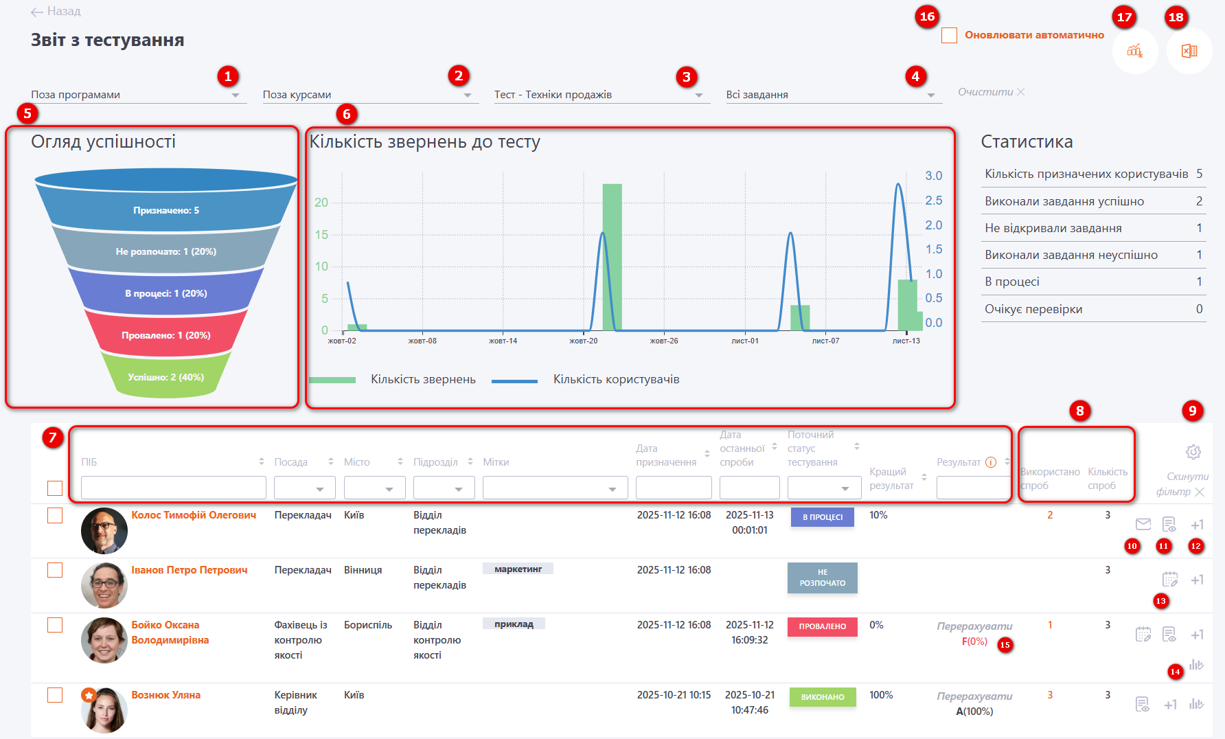 - (7) - поля для фільтрування і сортування таблиці по таким даним: ПІБ користувача, Посада, Місто, Підрозділ, Мітки, Дата призначення, Дата останньої спроби проходження тестування, Поточний статус тестування, Кращий результат (з усіх спроб), Результат (залежно від параметрів завдання: останньої спроби або кращий з усіх спроб). Приклад правил, за якими може відбуватись фільтрація по полю Результат: