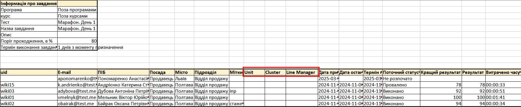 - Успішно - кількість всіх користувачів, що успішно пройшли тестування (статус виконання завдання у таких користувачів "Виконано");