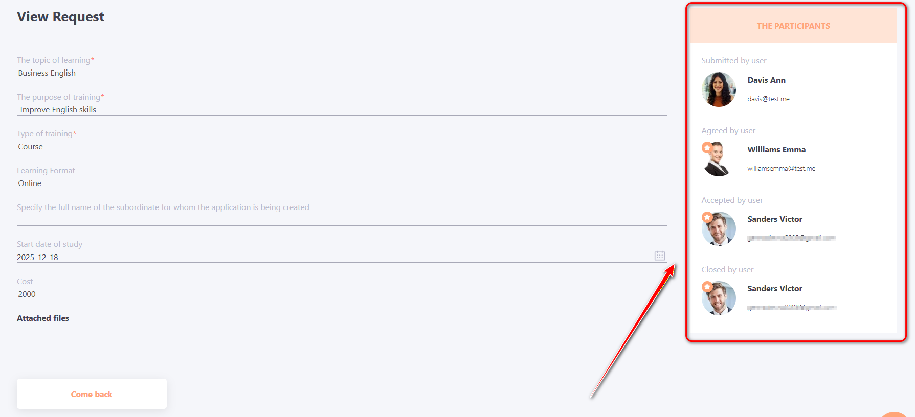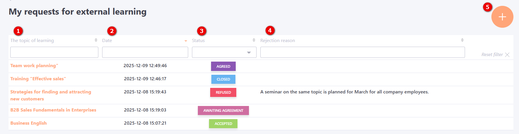 (3) - Status - display the status of the request: Awaiting agreement,Agreed, Accepted, Refused, Closed. The status of the request is changed by the Administrator or the Manager to their subordinates. Find more in Accepting request for external learning.