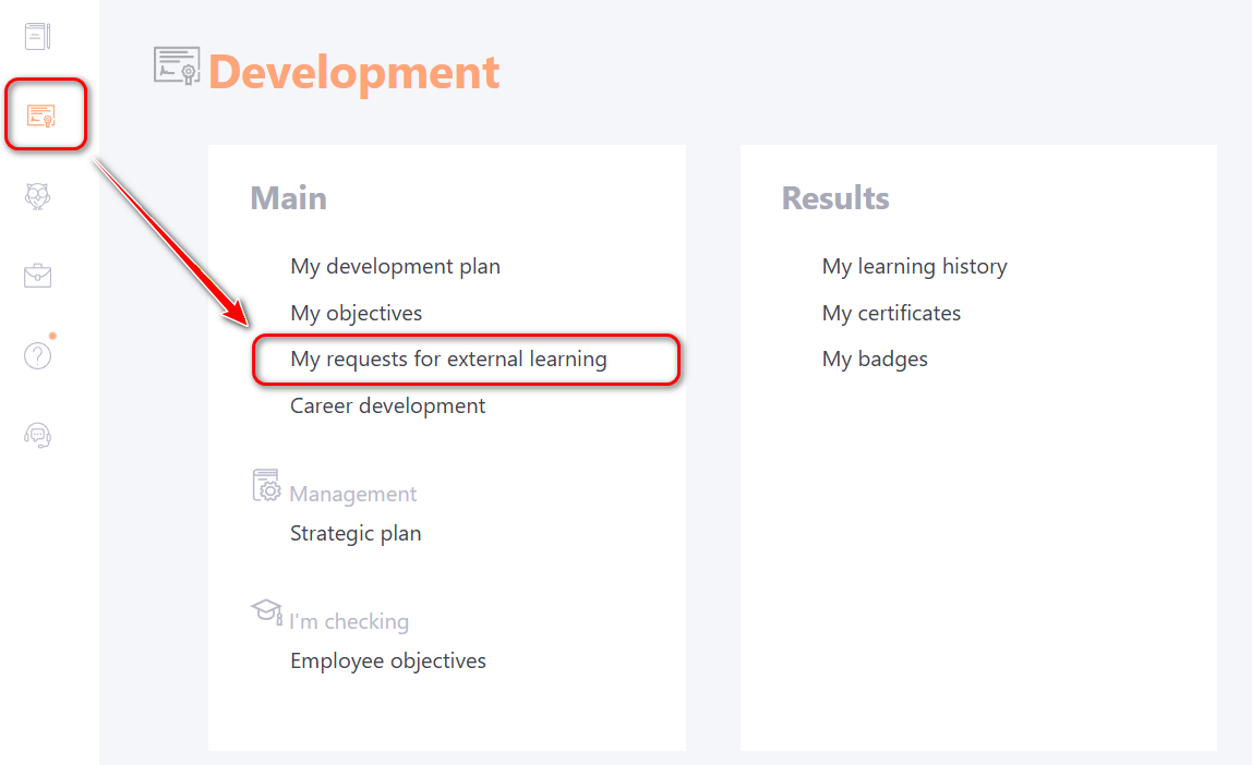 Users can view all their created external learning requests through the Development - Main - My requests for external learning menu.