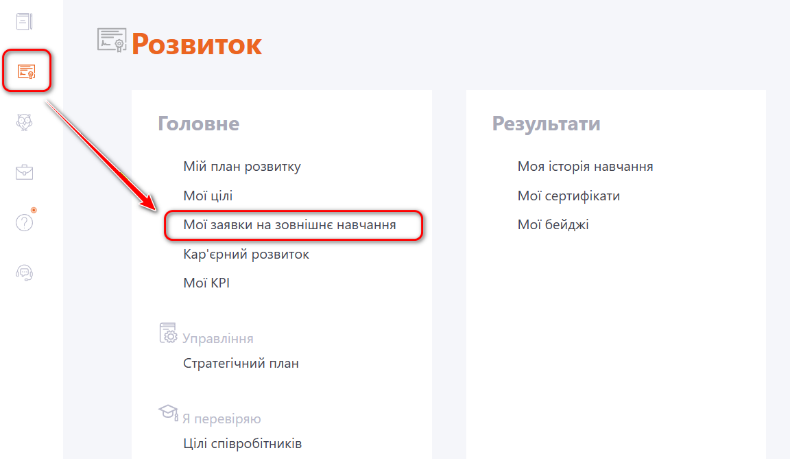 Користувач може переглянути всі свої створені заявки на зовнішнє навчання через меню Розвиток - Головне - Мої заявки на зовнішнє навчання.