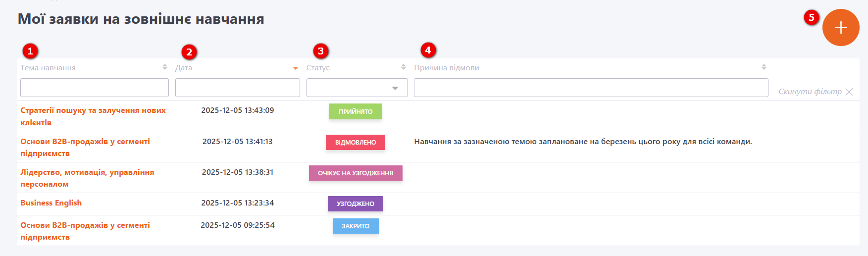 (4) - Причина відмови - відображається коментар з причиною відмови, якщо керівник або адміністратор його залишили при відхиленні заявки на навчання.