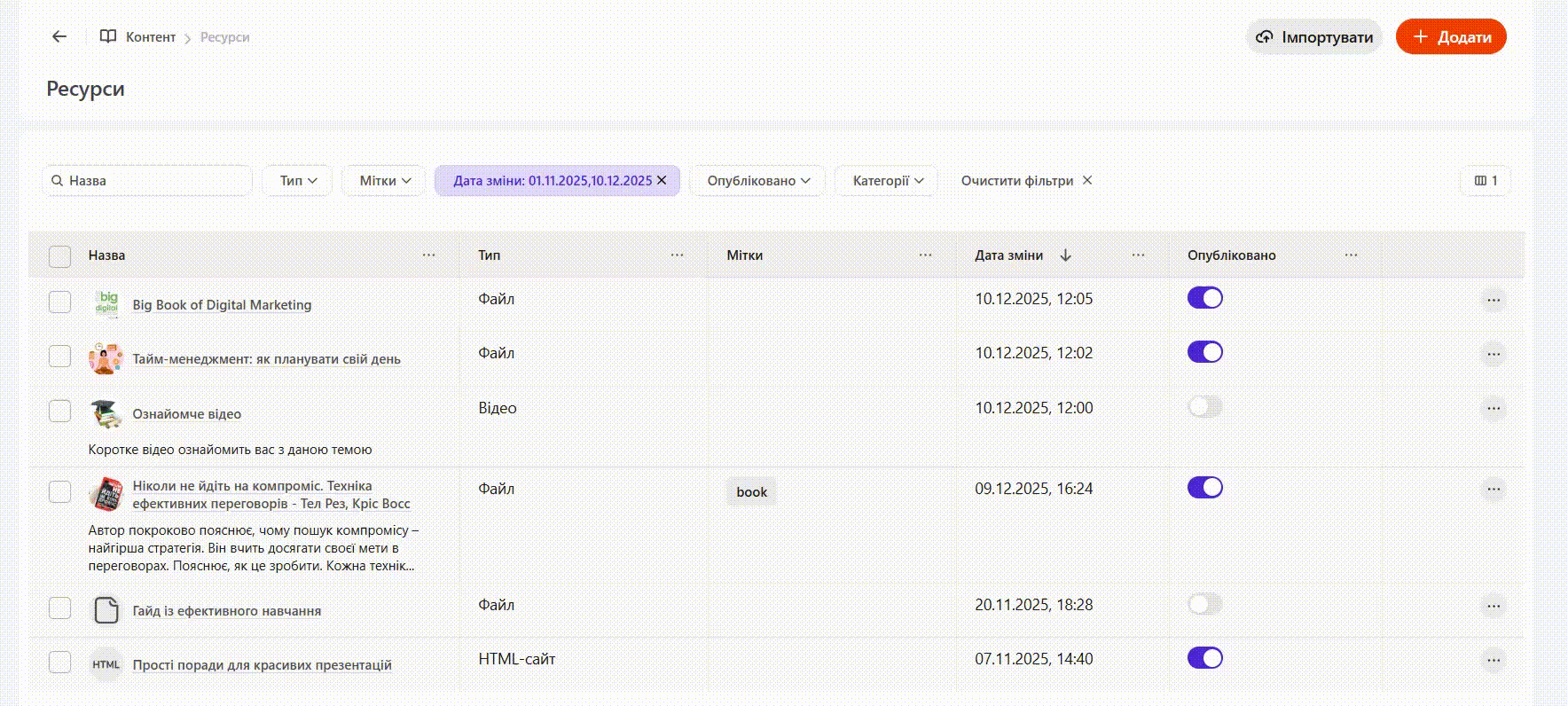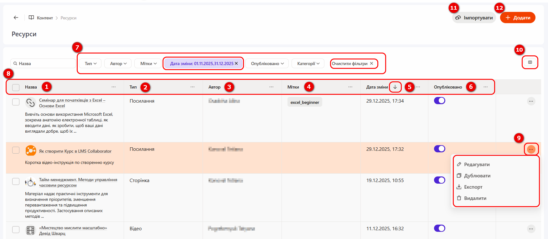 (6) - Опубліковано - після створення ресурс потрібно опублікувати. Тільки опубліковані ресурси можна використовувати в курсах, програмах, завданнях та базі знань.