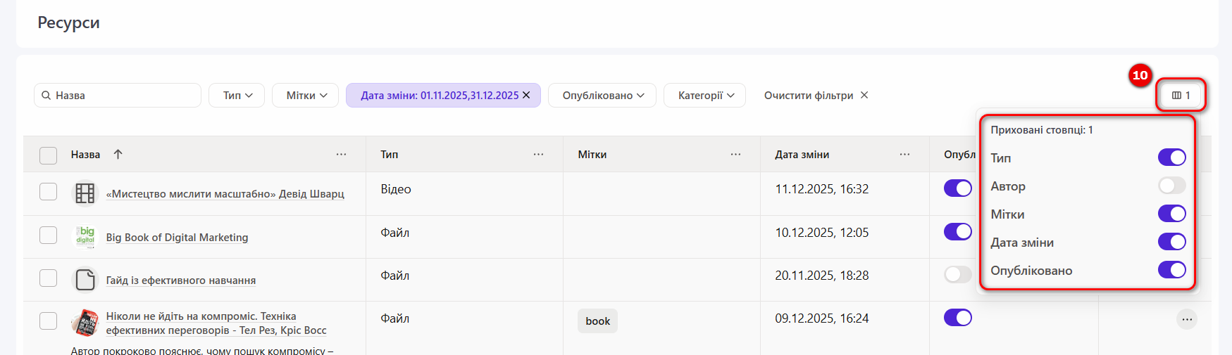 За допомогою кнопки «Приховані стовпці (10)» можна налаштувати відображенння стовпців з потрібною інформацією. Якщо перемикач увімкнено (синього кольору), відповідний стовпець відображається в таблиці; якщо вимкнено — стовпець приховано. Кількість прихованих стовпців вказана безпосередньо на кнопці.