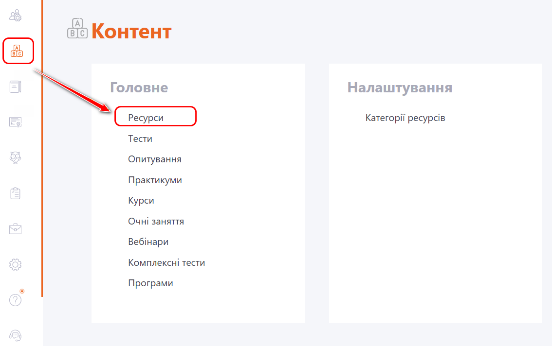 Для переходу до таблиці з ресурсами увійдіть в меню - Контент - Ресурси: