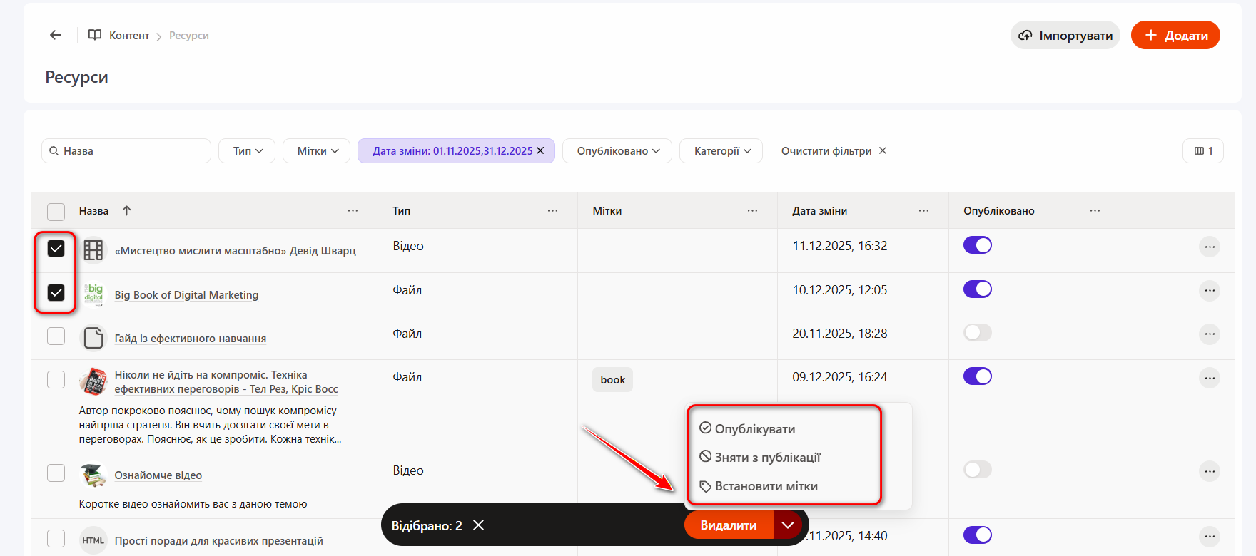 Для зручної роботи з ресурсами передбачено можливість групових дій. Для цього необхідно позначити потрібні ресурси за допомогою чекбоксів - після чого в нижній частині екрана з’явиться панель із доступними діями.