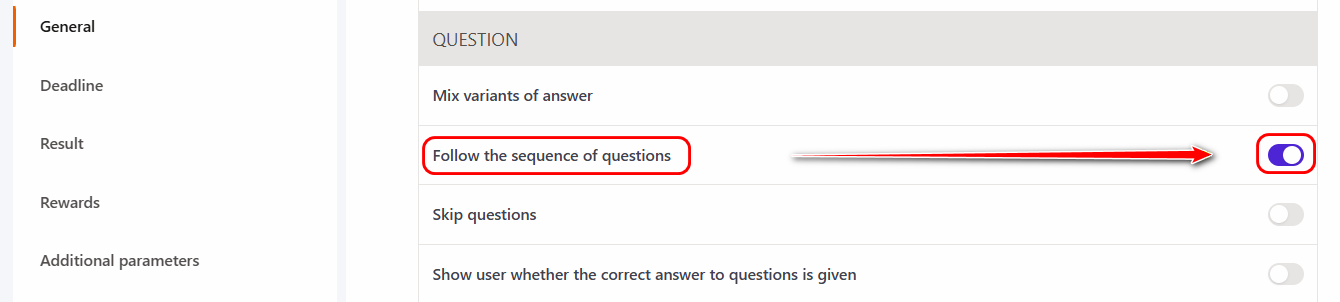 To ensure that users see the questions in the order you specified during the quiz attempt, go to the Create/Edit Tasks – quizzes page and enable the "Follow the sequence of questions" option in the Settings block. More details in Creating tasks-quizzes - Settings Block.