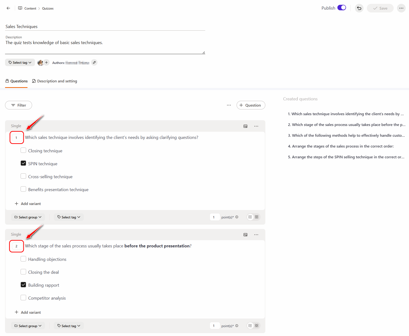 Each question is given a specific sequence number. By default, numbers are assigned automatically according to the sequence of the added question. If the question was added first - it will be under the number 1, if the second - under the number 2, etc.