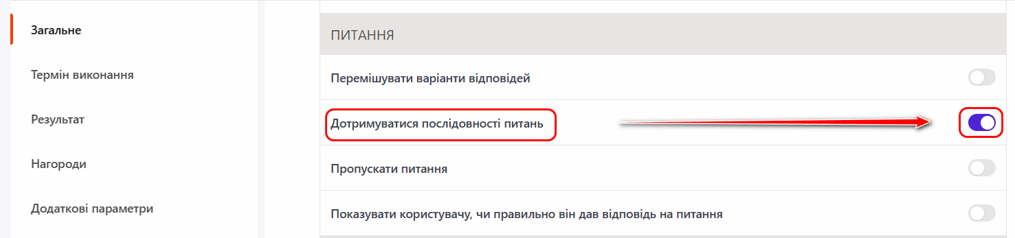 Щоб користувачам, під час проходження тестування, відображались питання в тій послідовності, яку ви вказали - потрібно на сторінці Створення/Редагування завдання - Тест в Блоці Налаштування ввімкнути опцію «Дотримуватися послідовності питань». Детальніше в Створення завдань-тестів