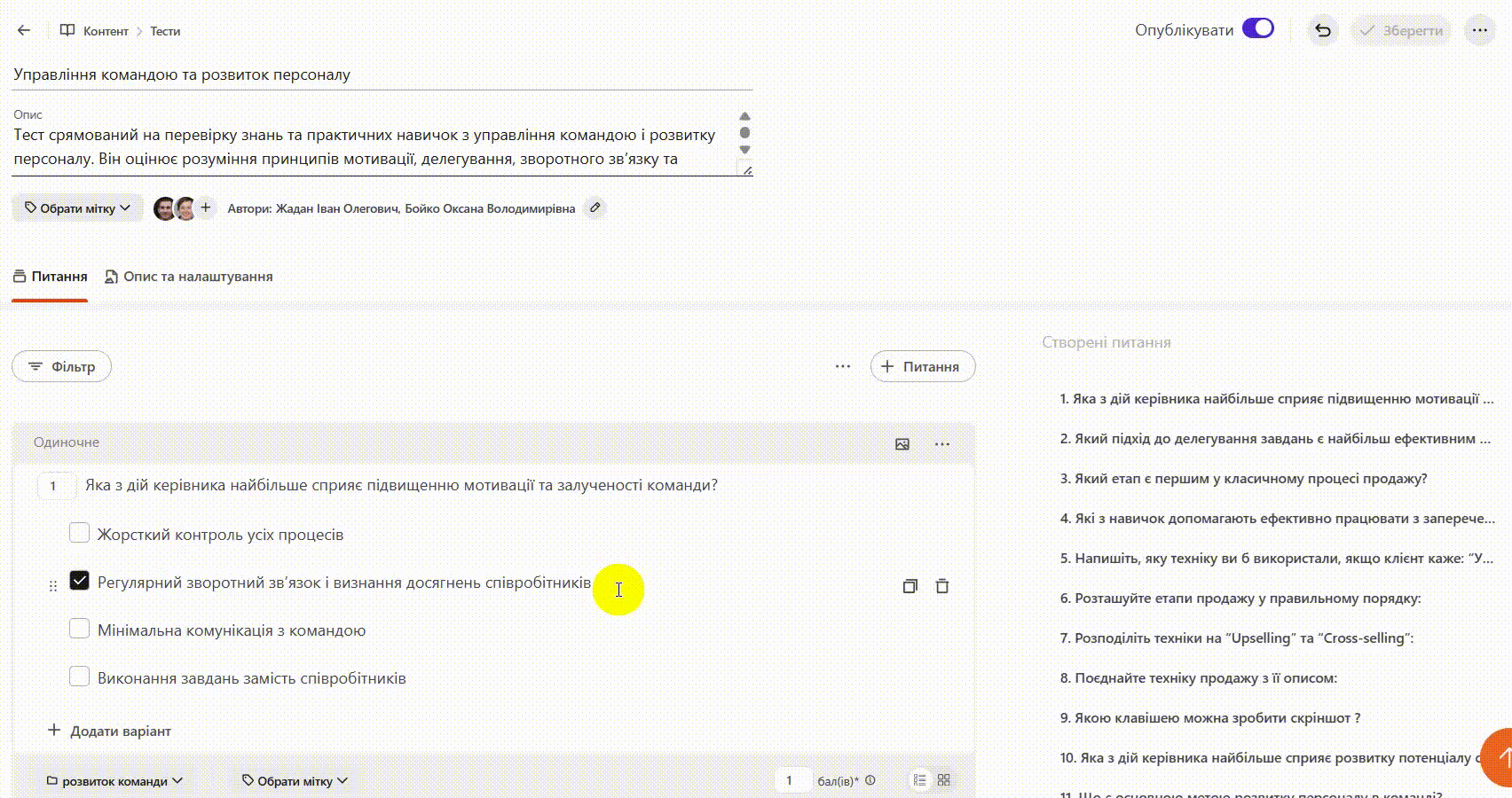 - Перетягуванням - для зміни порядку питань у переліку Створених питань наведіть курсор ліворуч від порядкового номера та перетягніть запитання за допомогою кнопки, що з’явилася; при цьому нумерація решти питань оновиться автоматично: